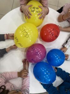 Κατασκευάσαμε ένα ανθρωπάκι πάνω στο οποίο γράψαμε πολλές φράσεις οι οποίες μπορούν να πληγώσουν έναν άνθρωπο. Στη συνέχεια, λέγοντας αυτές τις φράσεις, κόβαμε κι από ένα κομματάκι από το ανθρωπάκι μας. Καταλήξαμε στο συμπέρασμα ότι όσα καλά λογάκια και να πούμε μετά, ο άνθρωπος μπορεί να φαίνεται ο ίδιος εξωτερικά, αλλά το αντίκτυπο που άφησαν αυτές οι φράσεις πάνω του δεν θα επουλωθούν ποτέ.